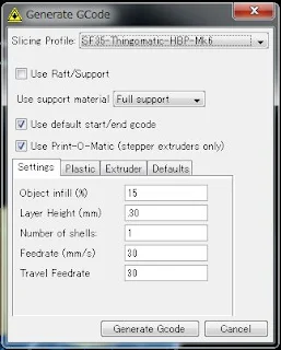 でも、x3gファイル作成時にファンをtrueにしてONになるようにしているのに造形中にファンが動かず、エクストルーダーのファンがONするハズのタイミングでヒートビルドプラットホーム(ベット)を間違えて温度管理無しで暴走加熱し続ける危険なバグが、相変わらずなおってないっぽい???のでRepridatorGに戻すかな~。まだ、β版だし。